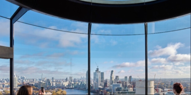 We are heading to Lift 109 at Battersea Power Station. This is a viewpoint. Additionally, it is a ride that feels like stepping inside a science fiction film. You glide up through the middle of one of Battersea’s iconic chimneys in a glass pod. It has lights and sound effects that set the mood. At the top, almost 109 meters up, there is a glass that opens onto jaw-dropping, 360° views.