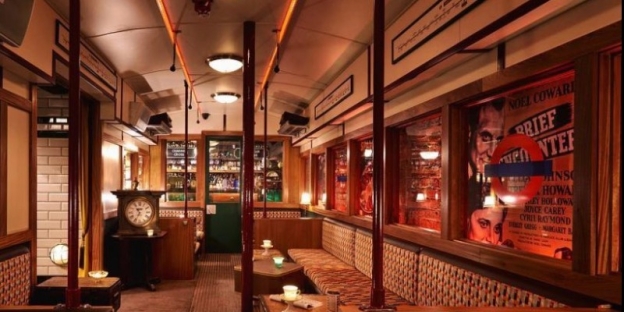 It is themed to perfection. There are vintage posters, staff in character, and swing music. It is theatrical drinking at its best. Yes, the cocktails are pricey. However, where else do you sip a martini in a fake Tube carriage?